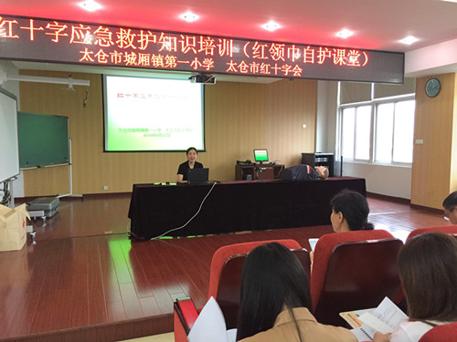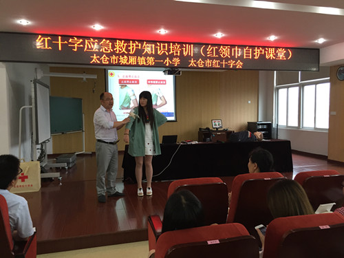 2016年6月27日下午,市红十字会专职副会长杨瑞兰和健雄学院救护讲师张秀庭来到太仓市城厢镇第一小学会议室,给学校全体教师进行了一次应急救护知识培训。