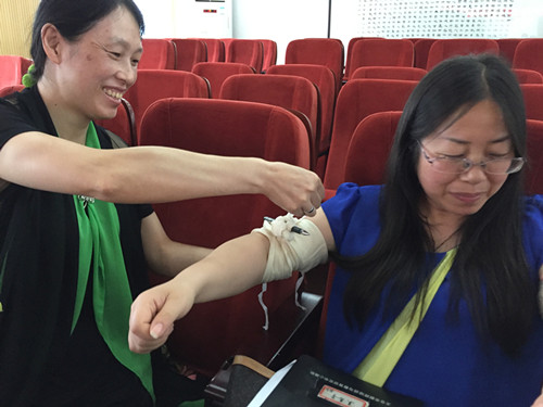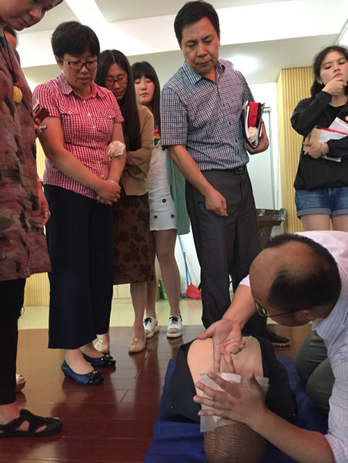 培训课程即紧张又充实,老师们不仅在讲座中学到了紧急处理意外伤害的知识,而且在体验中学会了心肺复苏和创伤救护的包扎技巧。