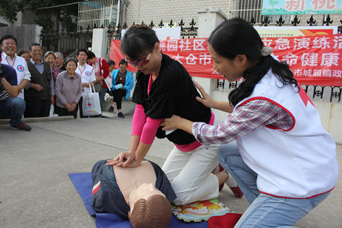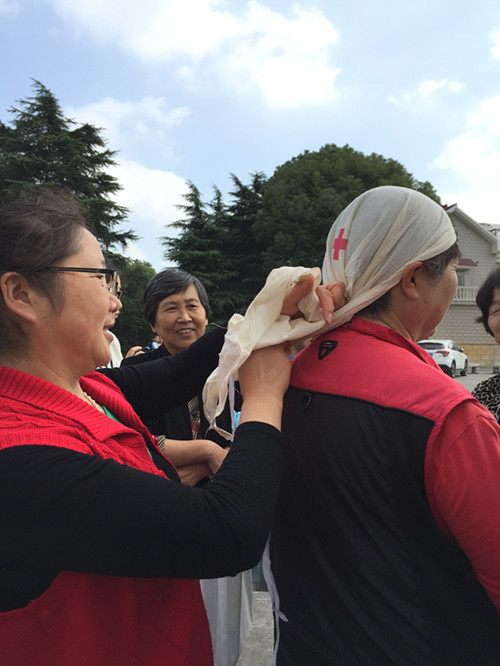 随着警报哨声响起,居民们在组长带领下快速地从各个楼道里紧急疏散到广场指定地点。疏散过程中居民们按照火灾逃生的要求尽量压低身体,拿毛巾捂着口鼻,井然有序,快速撤离,一分钟左右的时间110多人疏散完毕。随后市红会杨会长还在广场上进行了演练小结。为了让居民们掌握一些基本的救护技能,市红会工作人员带着模拟人、三角巾和绷带,给现场居民们讲解起如何正确开展急救,教他们心肺复苏、包扎等基本技能,居民们在工作人员的指导下学的也是有模有样。